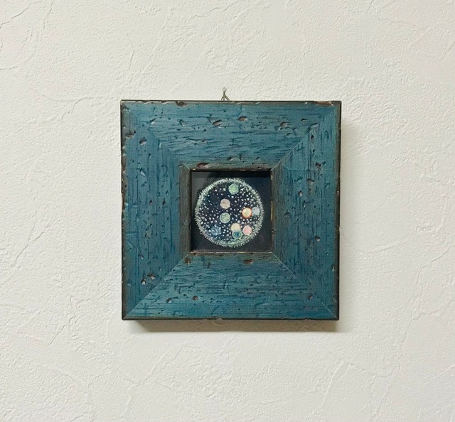 日本画 額付き(ガラス入) モチーフにボルボックスをカラフルに描きました。雲母(うんも)と呼ばれる絵具を使いキラキラとした質感に仕上げています。 素材:岩絵具・水干・和紙 額縁(H118×W118×D19mm) 共シールあり(証明書)